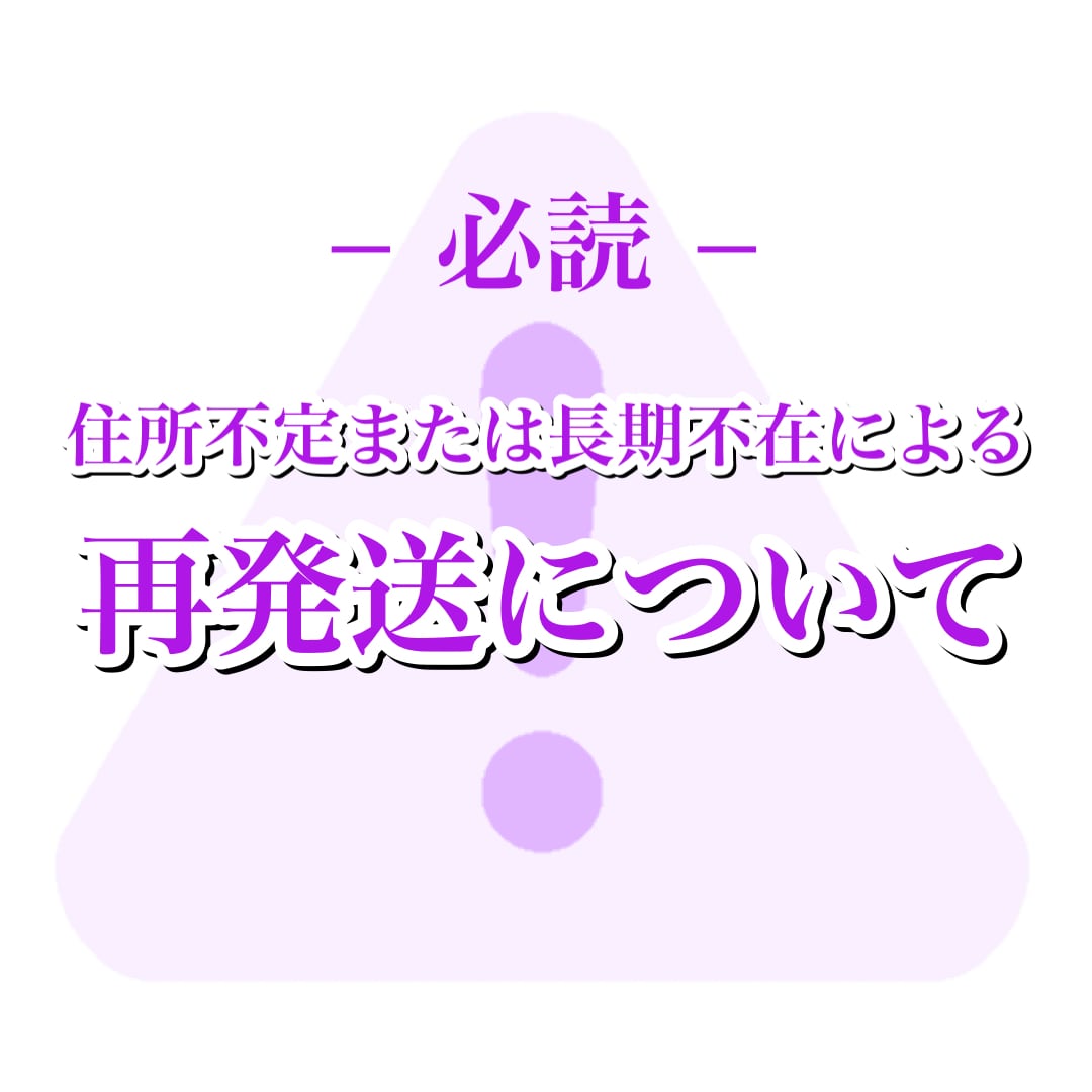 なお、お客様による住所間違いや長期不在により商品が返送された場合、再発送には【1,380円】の手数料と送料をご負担いただいております。
